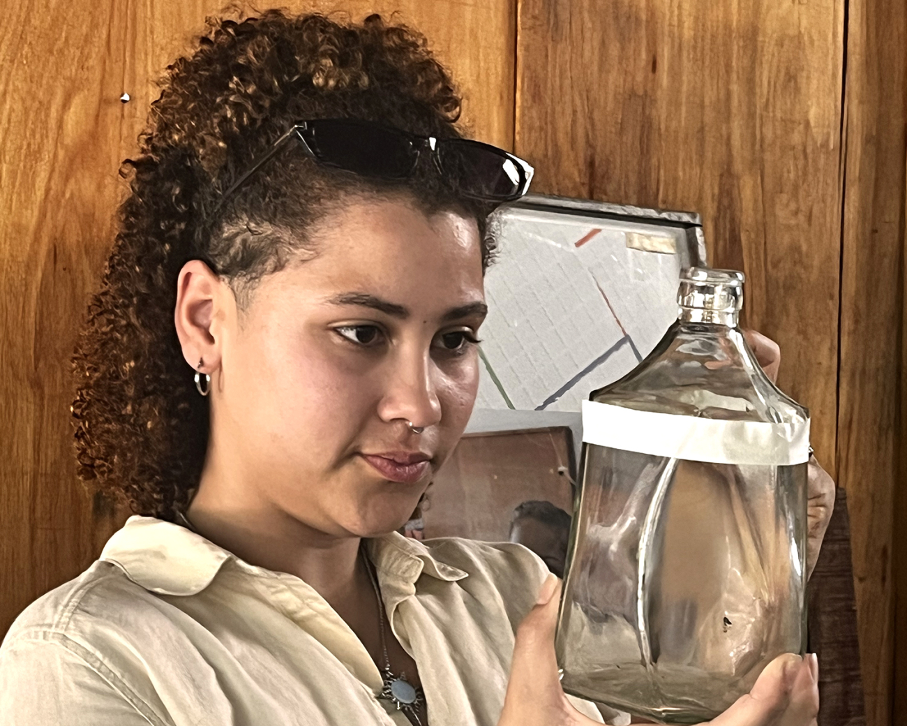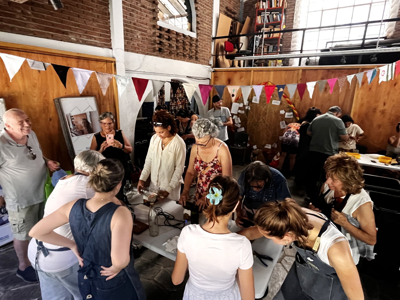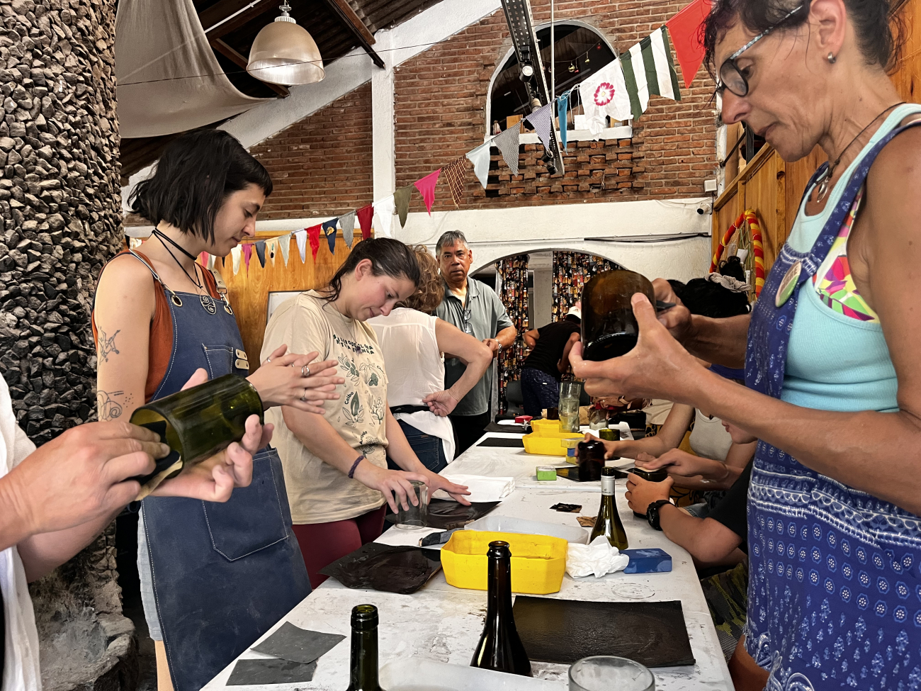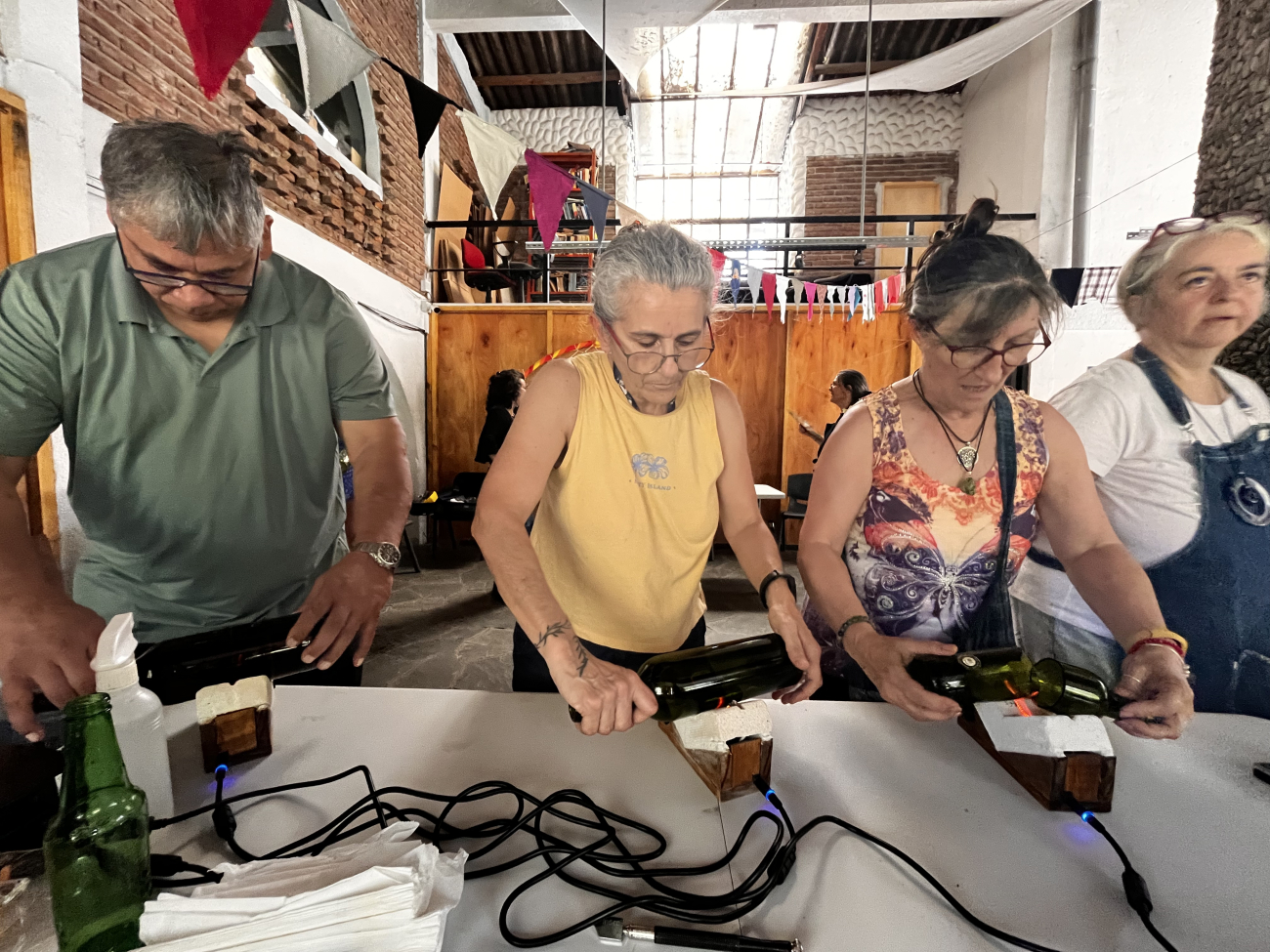 Durante más de tres horas vecinas y vecinos de la zona se acercaron con botellas para reciclar, transformándolas en vasos y floreros. El proceso, coordinado por Beatriz Amorín, incluyó tres etapas: marcado, corte y pulido.
