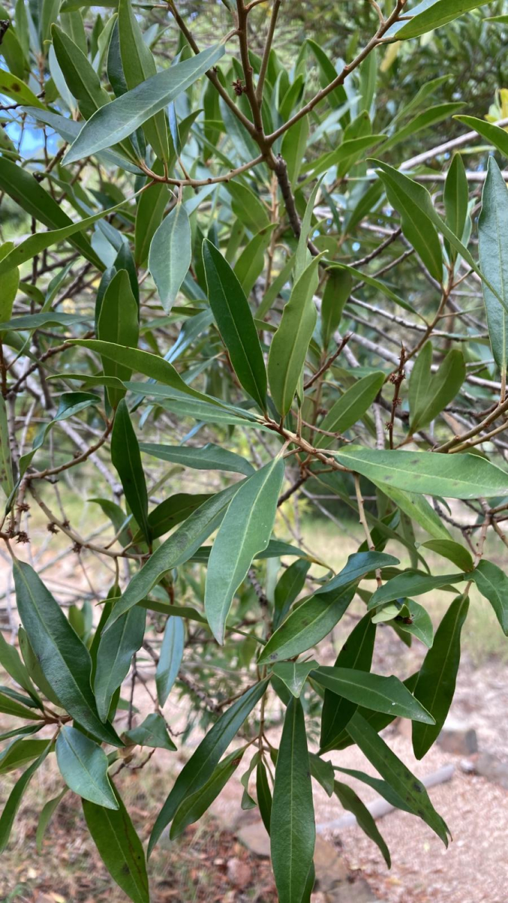 Las hojas de este árbol son perennes, es decir, se mantienen verdes durante todo el año. Son simples, con forma alargada y borde liso. La parte superior es de color verde oscuro, mientras que la parte inferior tiene un ligero tono ferrugíneo.