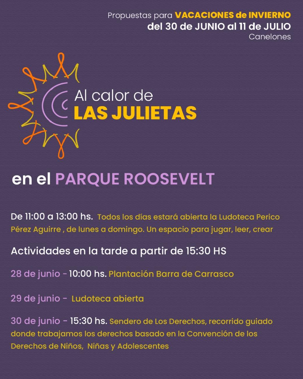 - 15.30 hs Sendero de Los Derechos, recorrido guiado donde trabajamos los derechos basado en la Convención de los Derechos de Niños, Niñas y Adolescentes