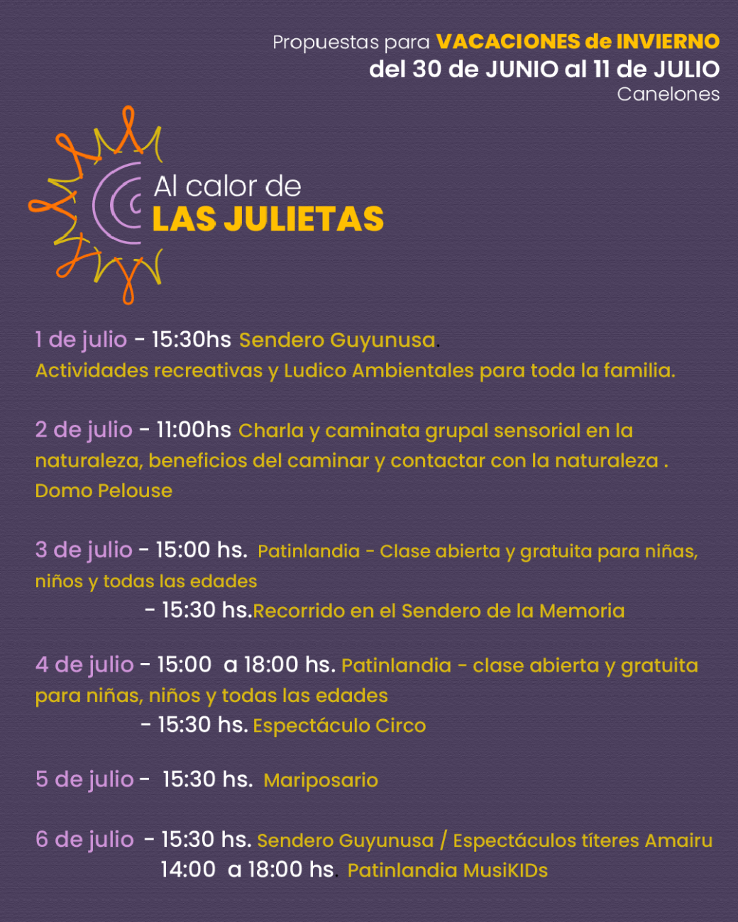 Senderos con plantaciones de especies nativas, recorrido guiado basado en los derechos basado en la Convencion de los Derechos de Niños, Niñas y Adolescente, espectáculos de circo, títeres así como visita al apenas abierto memorial Sendero de la Memoria, son algunas de las propuestas para disfrutar en las vacaciones de invierno y actividades especiales en Patinlandia También tendremos un taller de graffiti para adolescentes, para las infancias habrá espectáculos de circo y títeres.