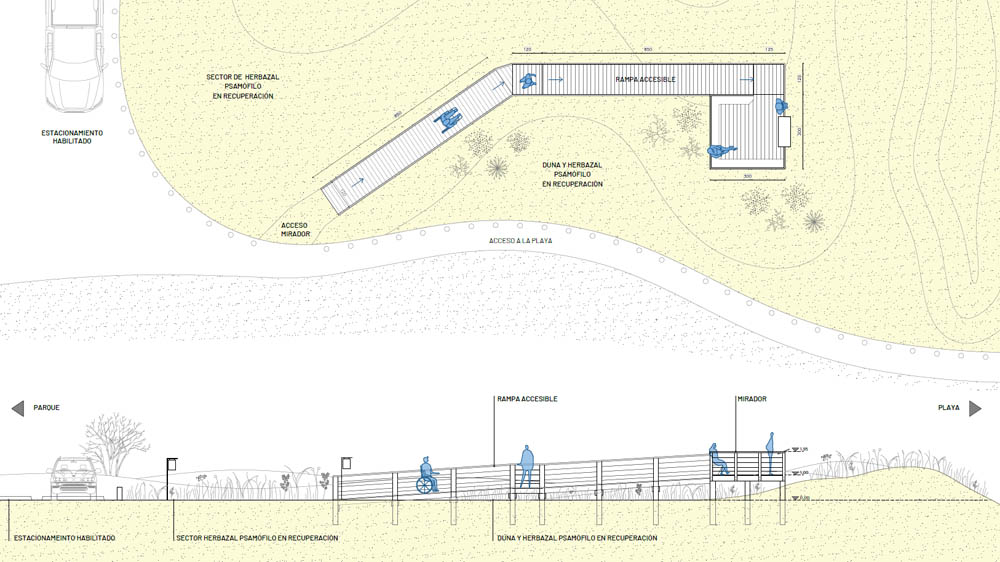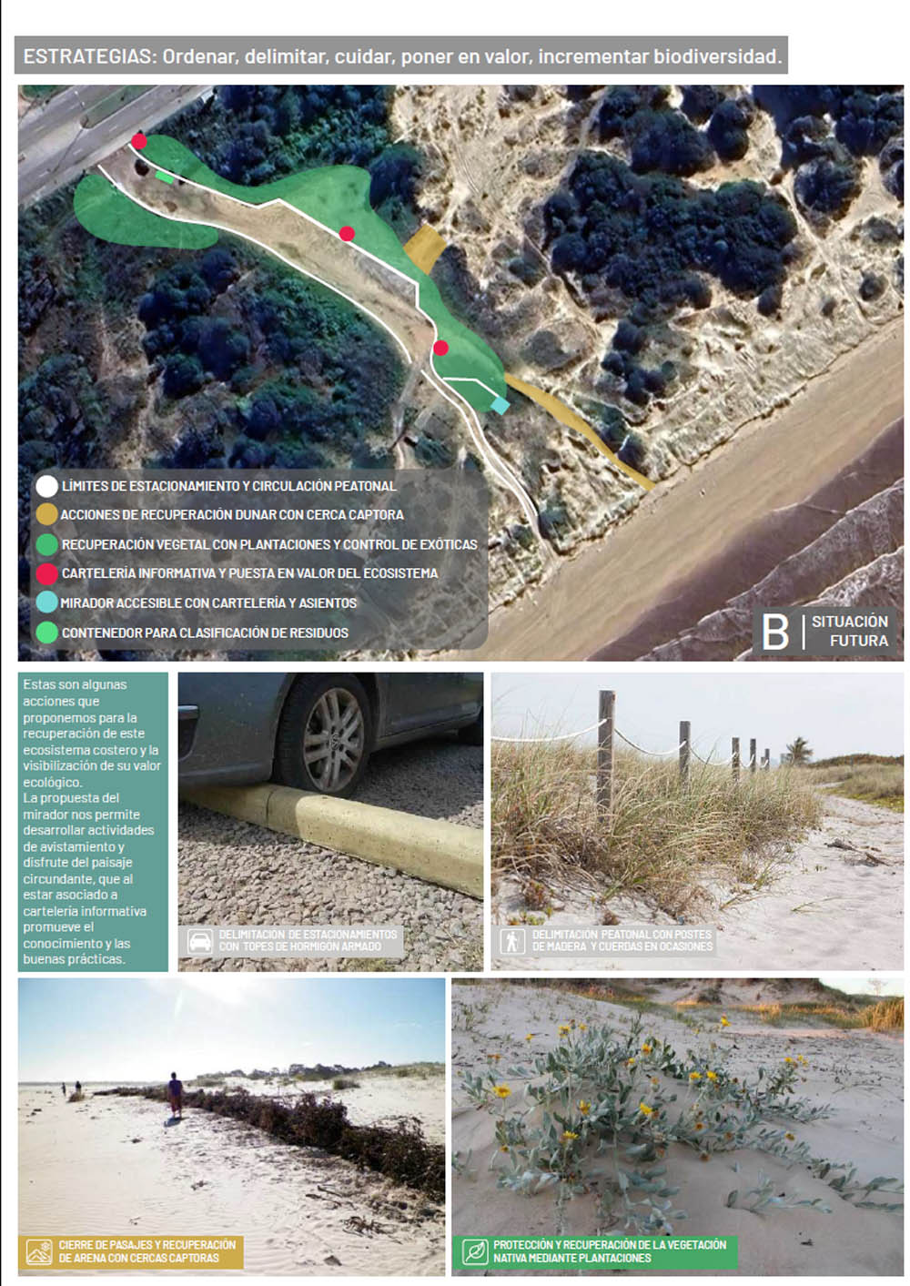 Se elaboró un proyecto de intervención en la bajada 6 con plantación de nativas costeras para restauración dunar, acompañada de otras acciones como delimitar zonas de estacionamiento y circulación, mirador con pasarela accesible, cartelería.